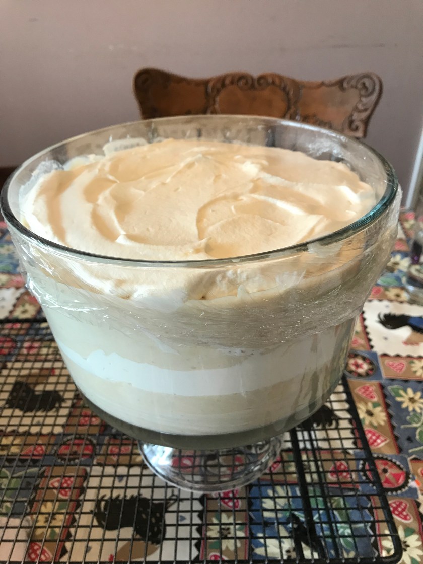 The tricks? I bought a bag of frozen periogis at Costco and added the toppings. For the pepperoni rolls, I bought a bag of frozen Rhodes rolls, thawed them on a tray, tore them in half, flattened each piece into a small disc, laid a few slices of pepperoni into each one, rolled them and baked them. The recipe for the “shortcut” bundt cakes are at the bottom of this post. Both puddings were made completely from scratch and required much more attention. These shortcuts still make for delicious “heritage” food without as work. And those are just my contributions. There will be even more deliciousness at the reunion!