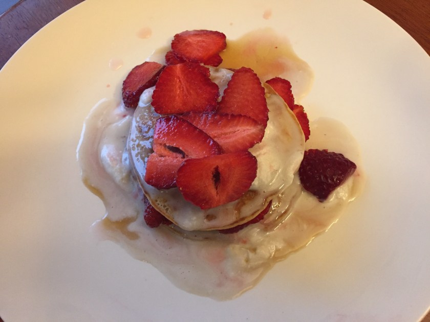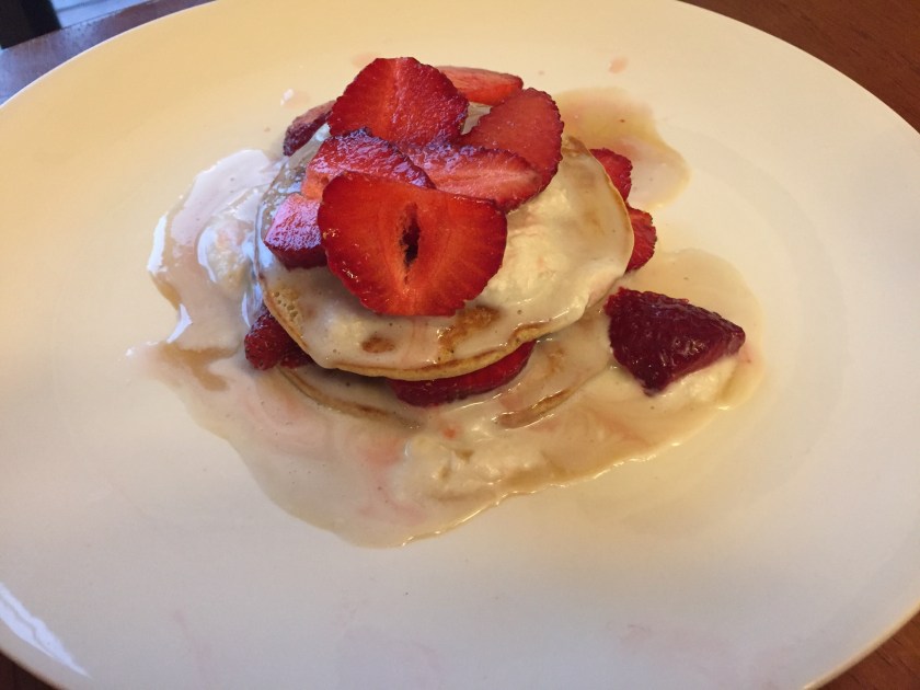 Layer a pancake on a plate. Drizzle with pure maple syrup. Spread a dollop of whipped coconut cream on top and add fresh sliced strawberries. Repeat layer if desired.